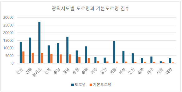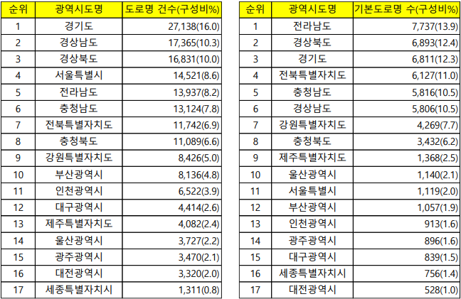 도로명코드 건수로 파악되는 도로명 개수는 경기도가 가장 많은 것으로 나타난다. 그 이어서 면적이 넓고 도로망이 발달되어 있는 지역들의 도로명이 많은 것으로 나타난다. 그러나 기본도로명의 건수로 볼 때는 전라남도가 가장 많은 기본도로명을 가지는 것으로 나타났다. 군단위 농촌지역이 많은 광역도가 도시지역인 광역시보다 기본도로명이 많은 것으로 나타났다. 이는 도시지역에서는 긴 도로를 따라 여러 개의 종속되는 길이 많은 특성으로 인해 기본도로명을 공유하는 도로명이 많은 것이 그 이유로 짐작된다.
