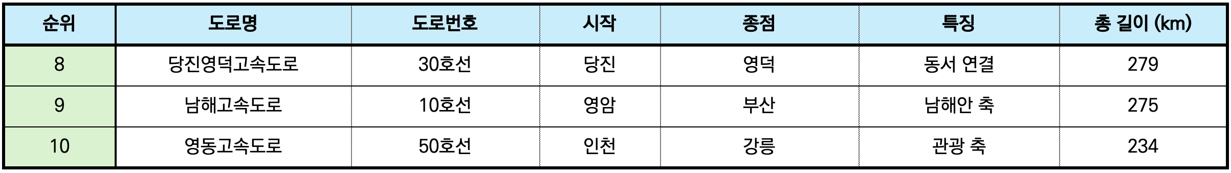 대한민국의 최장 도로 상위 TOP10 중 동서로 뻗은 도로들은 아래와 같다.