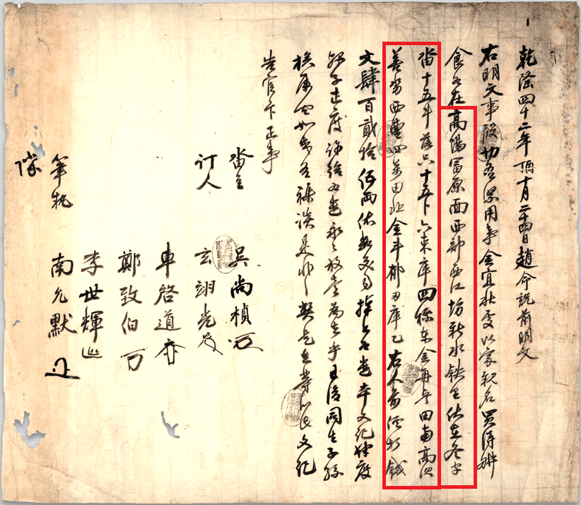 먼저, 오른쪽 첫번째 열에 이 문서가 어떠한 문서인지 적혀 있다. ‘乾隆四十二年頂十月二十四日趙命說前明文(건륭사십여년정십월이십사일조명렬전명문)’. 건륭(乾隆)은 영조 때의 연호로 건륭 42년은 1777년이다. 명문은 토지 등을 매매할 때 판매자가 구매자에게 작성해 주는 문서를 말한다. 즉, 1777년 10월 24일에 토지 구매자 조명렬에게 작성해 준 문서다.