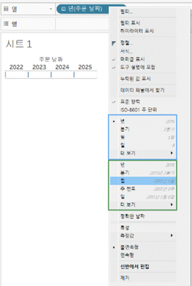 날짜 필드를 우클릭하면 ‘월’이 두 번 나옵니다. 위의 ‘월’은 날짜 부분(Date Part)으로 불연속형이고, 아래의 ‘월’은 날짜 값(Date Value)으로 연속형입니다. 이름이 같아서 아무거나 골라도 될 것 같지만, 결과가 전혀 다르게 나옵니다.