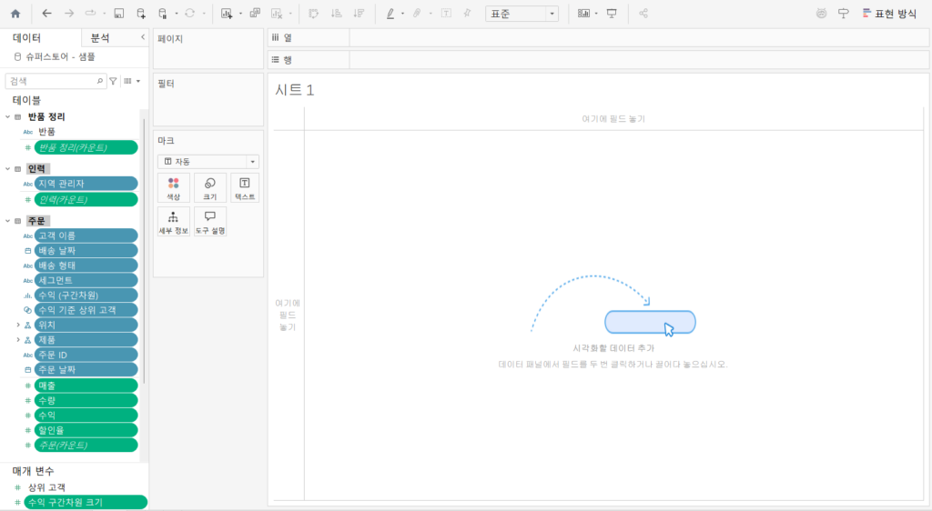 ※ 참고: 현실에서는 고객 수(1명, 2명)처럼 불연속적인 숫자도 있고, 온도(36.5°, 36.7°)처럼 연속적인 숫자도 있습니다. 하지만 태블로가 데이터의 성격을 하나하나 판단할 수 없기 때문에, 숫자 측정값은 일괄적으로 연속형(초록색)으로 표시합니다. 필요할 때 사용자가 [우클릭 -> 불연속]으로 바꾸면 됩니다.