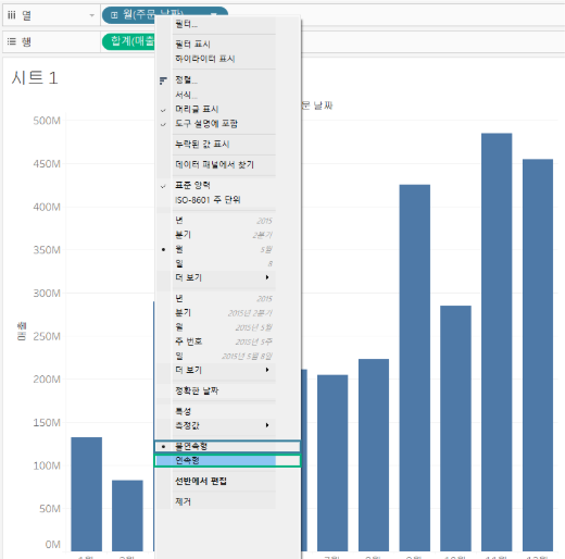 선반에 올라간 필드를 우클릭하면 ‘불연속형‘과 ‘연속형’을 자유롭게 전환할 수 있습니다. 데이터 자체는 변경되지 않으며, 태블로가 해당 필드를 처리하는 방식만 달라집니다.