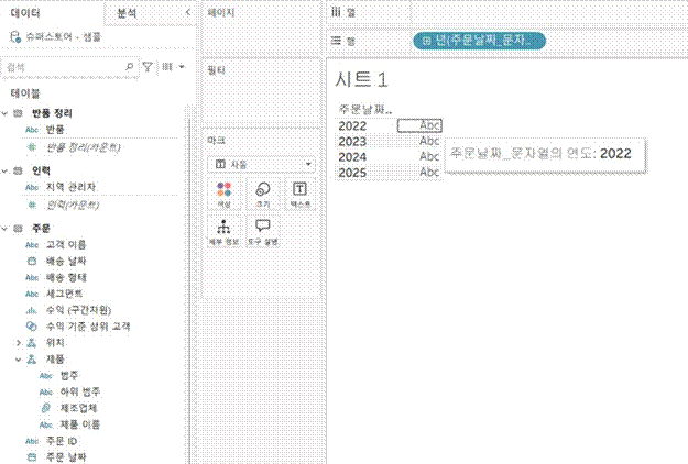 날짜가 문자로 인식되면 연속/불연속 전환, 날짜 드릴다운, 날짜 계산(DATEDIFF, DATEADD 등) 등 태블로의 날짜 기능을 사용할 수 없습니다.